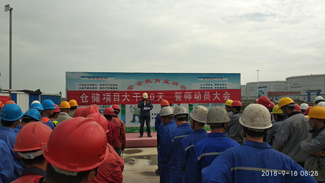 集团项目部部长方壮志做动员讲话、仓储项目尚亚儒部署工作安排、盛华监理总监刘延臣、东营广泰项目经理成新林、中国南海项目经理梁克章、中建三局项目经理韩黔林做表态发言,仓储公司徐兴海做总结讲话。