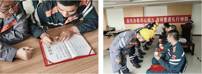 此次活动由安全环保部宋真真主持。活动伊始,主持人向众人介绍了各位经验丰富的师傅。这些师傅长期扎根生产一线,故而举止从容,脸上挂着淡淡的微笑,与朝气蓬勃却略显青涩稚嫩的徒弟们形成了鲜明对比。不过,徒弟们个个满怀求知欲与对未来的期望,其未来发展未必会比师傅们逊色。桌面上摆放着一张庄重的拜师帖,师傅与徒弟在拜师帖上郑重签署自己的名字。这一行为标志着技艺、精神与责任的传承,意味着彼此间建立起了信任与期待,共同开启了成长的全新篇章。这一刻,不仅是一份书面约定的达成,更是匠心与薪火交织传承的起点。
